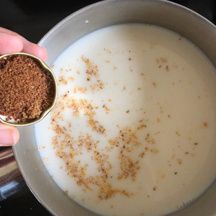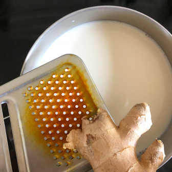 Mettre le lait sur le feu et râper un peu de curcuma puis du gingembre et de la noix de muscade.